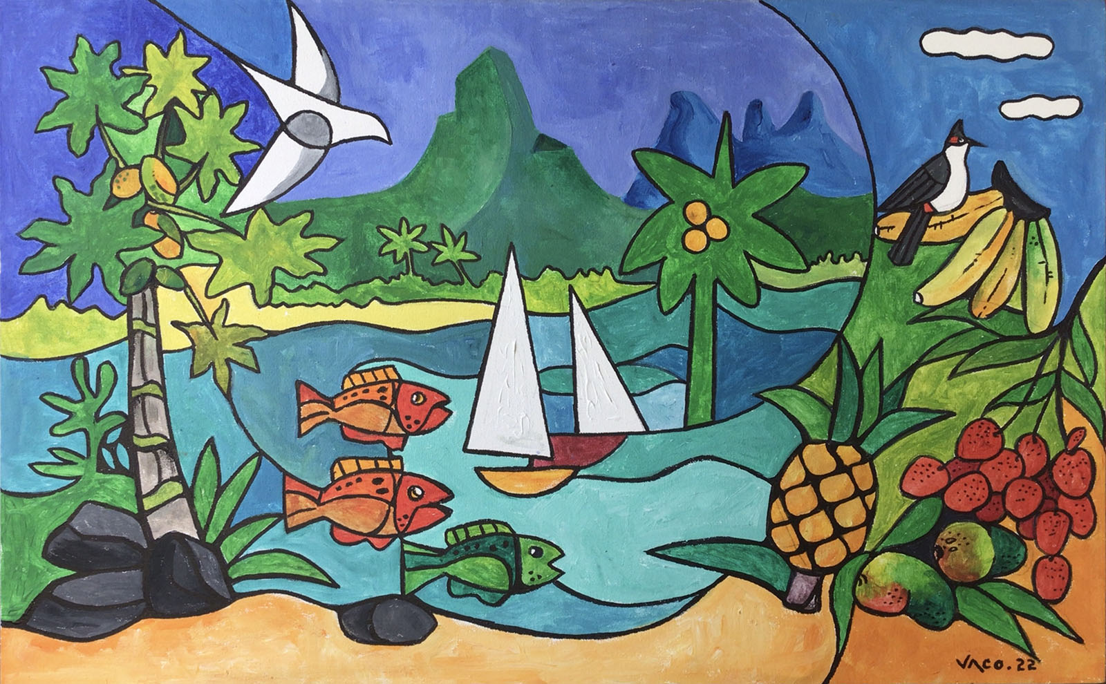Vaco's work is widely recognised for its aesthetic metaphors of islands, sun, and light, blending naturalistic imagery with influences drawn from cubist and kaleidoscopic composition. A proud Creole artist, he often described his practice as "painting in Creole," reflecting his deep connection to Mauritian culture, identity, and everyday life.